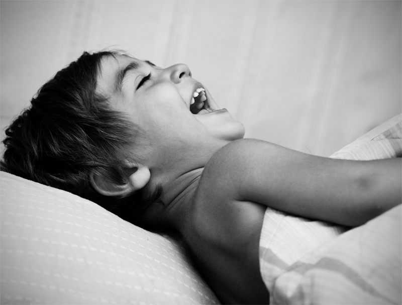 Il ritratto si "fa" lì, ....nel segno scuro delle ciglia folte e allegre come nel bianco brillante dei denti, ...nell'abbandono del piccolo Andrea che pare arrendersi, quasi fosse "naufrago" tra le lenzuola, alla dolocezza di questo istante.