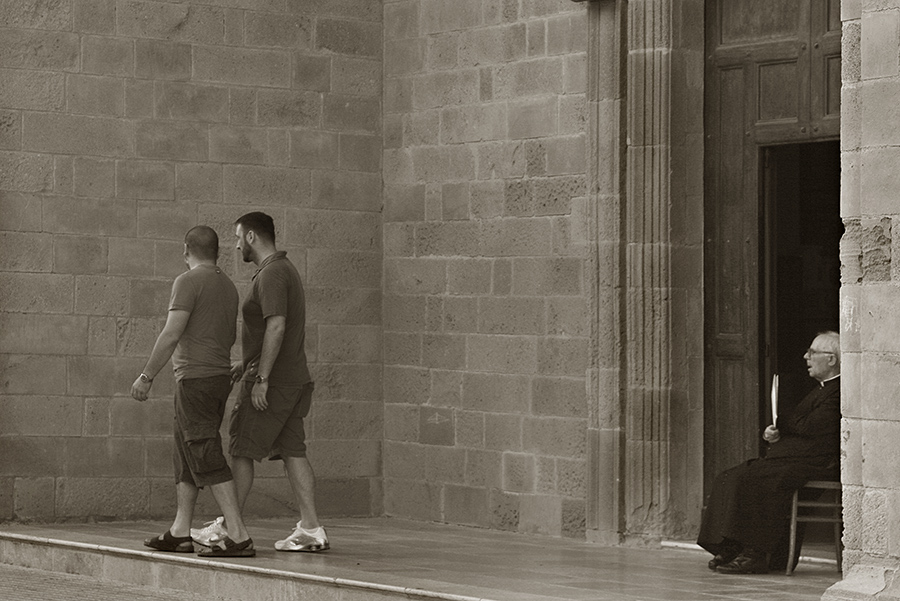 L'anziano ed accaldato sacerdote, forse più che indignato dell'ineleganza e sfrontatezza dei due, a suo paregone, discinti passanti, prova tormento e noia per l'abito talare che tanto lo fa sudare.