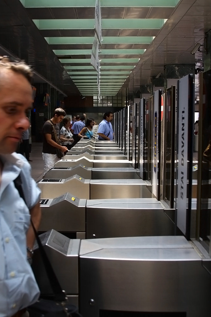 | La prospettiva di questo fotogramma verticale, e la ripetizione ritmata dei passaggi in sequenza di questa metropolitana milanese rappresentano l'unico centro di attrazione. Sono presenti delle figure umane riprese in atteggiamenti quotidiani: la prima sfuocata in primo piano che disturba la scena ed altre in prospettiva e a fuoco sullo sfondo. I contorni di alcune di queste ultime tendono a confondersi fra loro. Nessun gesto o espressione o momento particolare viene catturato a sancire le caratteristiche street dell'istantanea. La location poteva esser buona per eseguire qualche scatto interessante ma il contenuto appare debole. |