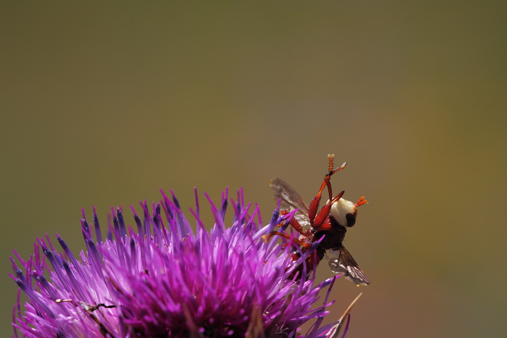 L'insetto mi incuriosisce parecchio, azzardare una classificazione intravvedendendo solamente una porzione del corpo non ne sono in grado. Concordo con Wildrocker inquadrato di fronte per un ritratto o di lato, stringendo maggiormente sul soggetto. Mi piace lo sfondo, uniforme e cromie gradevoli. Ciao Elio.