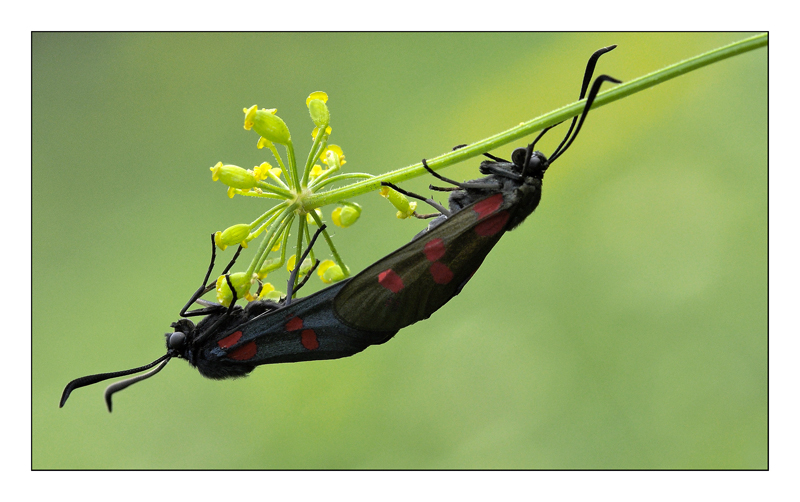 La Zygaena è una farfalla difficle da rendere leggibile in fotografia. Le sue ali riflettono parecchio la luce, in più il colore del corpo non aiuta nelle lettura del dettaglio.