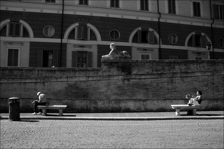 Dal mio punto di vista questa foto è troppo larga, basterebbe solo la metà di destra, tenendo solo la sfinge che sembra volare e quel ragazzo che hai avuto la fortuna di riprendere in una posa fin troppo curiosa, sembra che stia facendo del kitesurfing...la panchina come tavola e la sfinge come vela, il sanpietrino come un mare (s'incomincia a sentire il bisogno di vacanza)