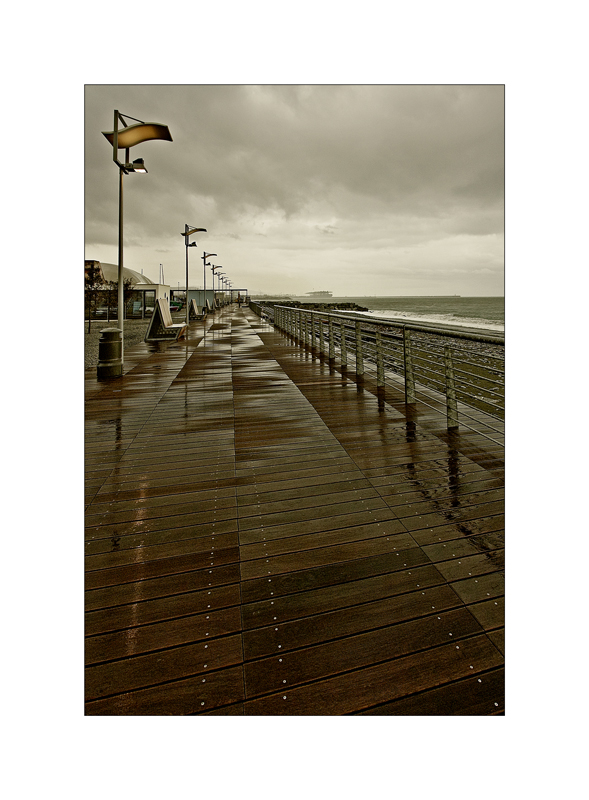 Bella, questa immagine lucida di pioggia. Atmosfera molto ben restituita. Bella la convergenza delle linee di fuga della balaustra e dei lampioni.