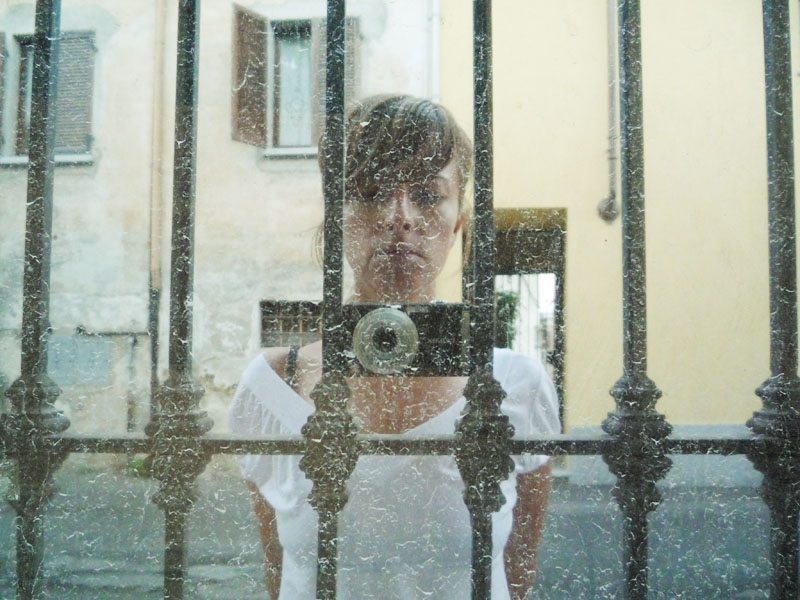 Questa foto non congela un istante soltanto, racconta anche un intorno temporale. Igreca guarda le sbarre curiosa, forse sono distanti tanto quanto e' larga la macchinetta. "Toh, ci va perfetta, si regge pure!". Autoscatto, 1 ,2 giu' le mani, 3, 4 anzi dietro, 5 ferma cosi', 6, 7, 8, 9 uffa, click. Fatto. Hmmmm... si e' un po' rigata sui fianchi la Lumix. Vabbe' ne valeva la pena...