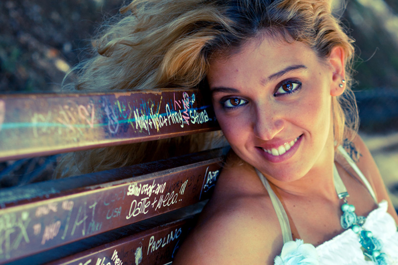 Gradevole sia sotto l'aspetto tonale che nella gestione della luce: aspetti che sostenuti dall'uso della panchina come linea guida sottolineano la buona espressione della modella: tuttavia, personalmente, trovo un pò troppo invadenti rispetto gli occhi le scritte prescenti, per cui avrei tentato qualche soluzione alternativa.