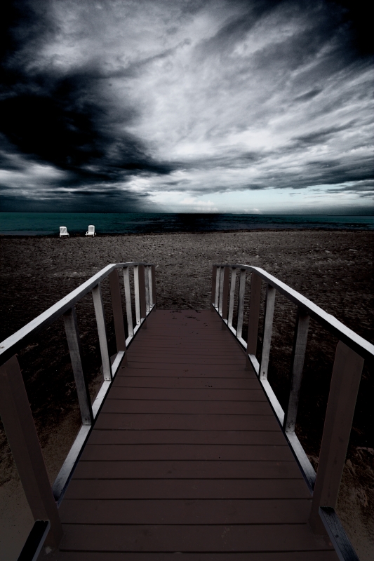 Le linee guida del pontile conducono l'occhio dell'osservatore verso un'atmosfera cupa data dai colori ed ad una immensa solitudine data dal vuoto della spiaggia rafforzata da quelle due piccole sdraio anch'esse vuote. Una foto un po' triste per ricordare l'estate, ma ognuno esprime ciò che sente.