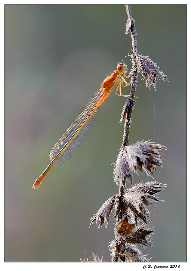 Bel contrasto di colori e tonalità tra il freddo del ramoscello e dello sfondo con l'arancione della libellula.