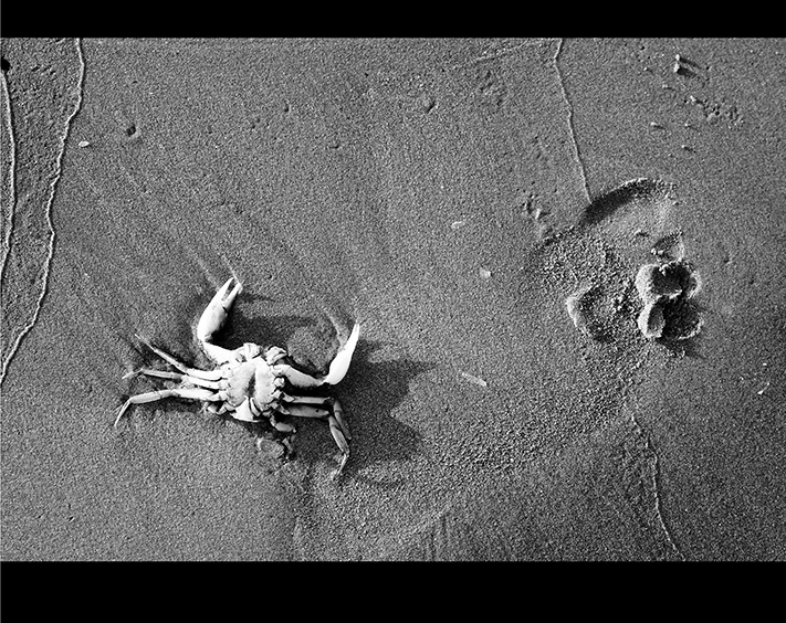 | Forse il tuo vuol'essere un forte messaggio, ma penso che a granchio posto al suo verso giusto, benchè morto, e senza impronta di piede d'uomo, avrebbe reso in altro modo, pur perdendo d'originalità. Non male la resa del b/n. |