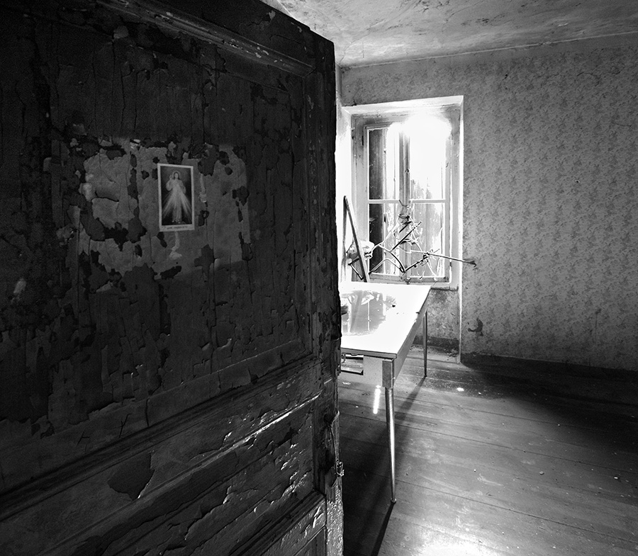 L'ambiente era particolare e fatiscente, e nell'ombra mi ha colpito quel santino appeso alla porta.