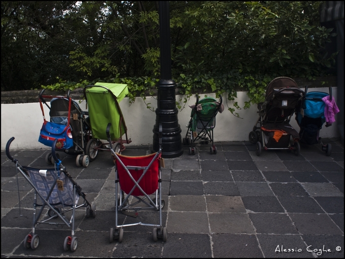 Lo scatto di Alxcoghe ci presenta sette passeggini per bimbi, di varia forma e colore, senza i rispettivi proprietari, disposti abbastanza ordinatamente all'interno di una piazzola di cemento, delimitata da un muretto bianco, basso, che la separa da una macchia folta di alberi e piante verdi. Al centro del frame abbiamo la base di un lampione e sulla destra l'inizio di una tendo-struttura. E' da sottolineare che i passeggini hanno tutti appeso un laccio con una targhetta chiara, con disegnato un numero identificativo. L'autore confeziona un campo medio con un' inquadratura grandangolare, un punto di vista quasi frontale ed un'inclinazione verso il basso, al fine di poter contenere tutti e sette i passeggini orientati dal loro lato posteriore ed ordinati nei pressi del muretto bianco. Un luogo tranquillo e sicuro dove sono stati parcheggiati questi passeggini; lo si deduce dagli oggetti lasciati a bordo: magliette e giubbottini legate ai manici, indumenti appoggiati sull'estremità o disposti nei ripiani bassi, delle borse appese. Comportamento che accomuna quasi tutti i passegini rappresentati. Un parcheggio tranquillo quindi, dove far sostare i passeggini e condurre i bambini da qualche parte li vicino, forse nella struttura che si intravede sull'estremità destra del frame, senza avere l'ansia di essere derubati. Un comportamento standardizzato e collaudato da tutti i presenti, frutto di una specifica organizzazione preventiva (portatarghette con numero). Che cos'è c'è di inusuale? Forse per un abitante di qualche paesino italiano potrebbe essere una novità questo parcheggio ma per un abitante di Chapultepec non credo. In questa piccola area di città rappresentata da alxcoghe, tutti i giorni o quasi, ci saranno il solito numero di paseggini ordinati, con delle medesime targhette numerate e gli stessi oggetti lasciati sopra. Niente che possa soddisfare una vera curiosità street. Niente che provochi lo scarto dalla norma tale da sancire le proprietà street. La composizione è curata nei particolari e il taglio piacevole, ma al di là di un richiamo metionimico ai bambini che sono assenti, al loro gioco chiassoso, non rimane altro.