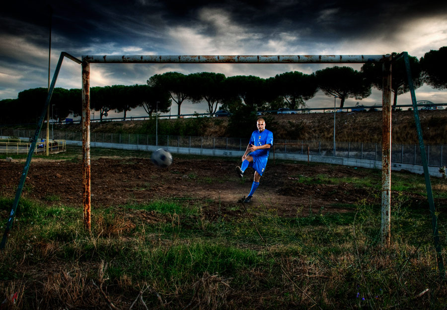 Io, viste le belle performace della nazionale, avrei messo il calciatore spalle alla porta (come se andasse via) e il pallone "sgonfio"vicino il palo o nei paragi.