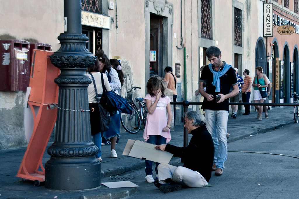 L'adesivo strappato via malamente dalla cassetta della posta, il tubo di sfiato verde alla faccia del decoro architettonico, l'abbraccio da due soldi della cassetta arancione al lampione ricco, qualche cartaccia qua e la'. Un uomo vestito bene, ma seduto a terra, ha catturato l'attenzione della bambina sotto lo sguardo attento del padre. Le sta mostrando un disegno? Cosa si stanno dicendo?