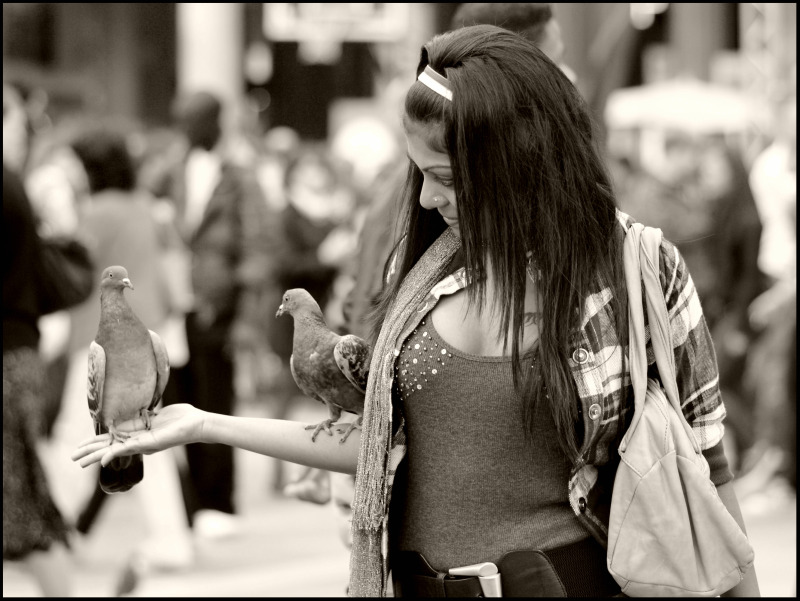 A parte ill titolo che mi ricorda molto una massima di cicciolina lo scatto è il classicissimo visto e stravisto nelle maggiori piazze d'Italia e non solo. Malgrado la sfocatura dello sfondo, purtroppo la capoccia con nappa del tizio dietro è ben visibile e si sovrappone con la ragazza in pp. Il bn con leggero viraggio non lo trovo male invece.