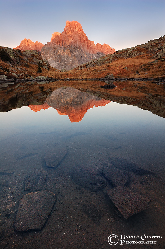 ciao enrico. Le tue foto sono sempre una garanzia! E' un'immagine che definirei soprattutto "pulita". IL rosso delle cime delle montagne spicca in maniera eccellente nel cielo azzurro. Il riflesso, grazie al laghetto piatto, è assolutamente speculare. E i massi in acqua riescono a rendere interessante pure il primo piano