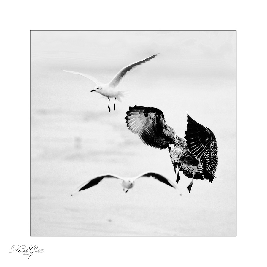 davvero una bella composizione con una perfetta pdc che mettono in evidenza i 3 gabbiani su 3 piani di fuoco differenti che vanno dal nitido di quello grande di dx, al meno nitido sopra e allo sfocato di quello in basso, questa combinazione rende lo scatto molto tridimensionale, buono anche il b/n  |