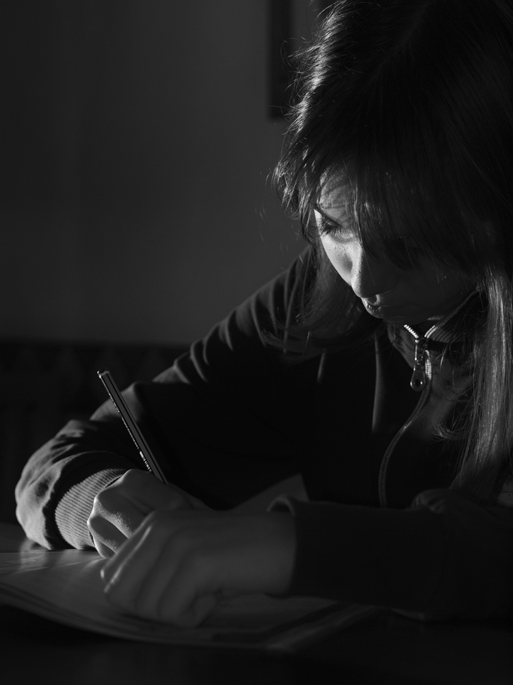 Un momento intimo di una persona. Unico appunto quella mano che copre il foglio dove scrive. un buon bn