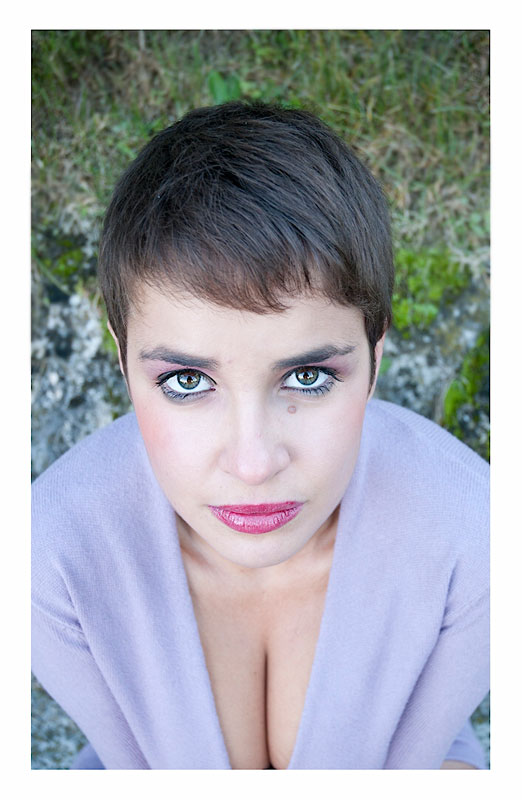 A mio avviso, seppur modesto, l'attenzione cade sugli occhi - poi va sul decolleté, che è giustamente sfumato - e sarebbe stato opportuno ridurre "l'aria" sopra la testa completando l'immagine, e togliere o scolorire il neo sotto l'occhio sin.-