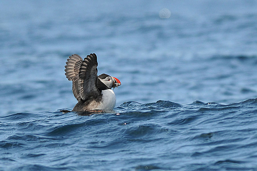questa foto è stata scattata all'isola di Runde,Norvegia, da una piccola imbarcazione .Il pulcinella era appena riemerso con nel becco una medusa.