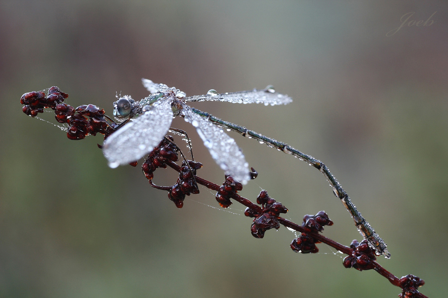 Diciamo che così pesantemente bagnata è difficile riconoscerla... il torace è coperto e i pterostigma nascosti dalla rugiada... per il resto uno scatto ben fatto, anche se avrei aspettato che si asciugasse almeno un pò... Wink