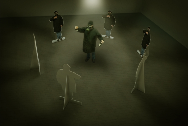 Tante sagome di compensato, una stanza spoglia e un brindisi viruale. La luce a faretto sul protagonista.