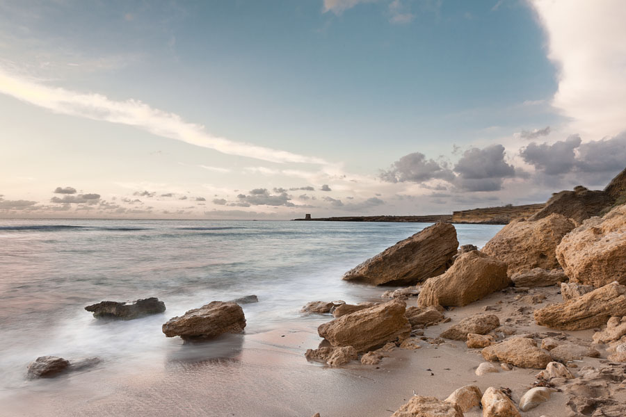 L'atmosfera mi sembra troppo luminosa e poco adatta forse alla scena rappresentata, ma può essere una questione di gusti. Altre due cose che non mi convincono sono l'orizzonte centrato e il piccolo sasso che spunta in basso al centro.