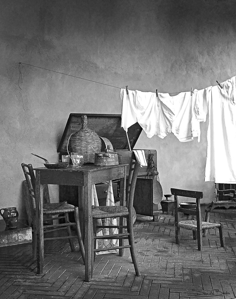 Se anche non ci fosse stata la sovraesposizione sulla biancheria (che è molto evidente) sarebbe stato comunque opportuno chiudere in maniera diversa a destra. In alto chiude bene; altrettanto direi sotto. A sinistra, dato che l' hai inclusa, qualche millimetro oltre il manico della brocca sarebbe stato auspicabile perché o si taglia o non si taglia: le vie di mezzo appaiono incerte se immotivate. Questo come linea generale, perché immagino che in questo caso non fosse possibile fare molto di più, dato che la foto sembra ripresa in una esposizione della civiltà contadina e non in una situazione reale dove si può intervenire per scegliere meglio il punto di ripresa e aggiustare eventualmente la posizione degli oggetti.