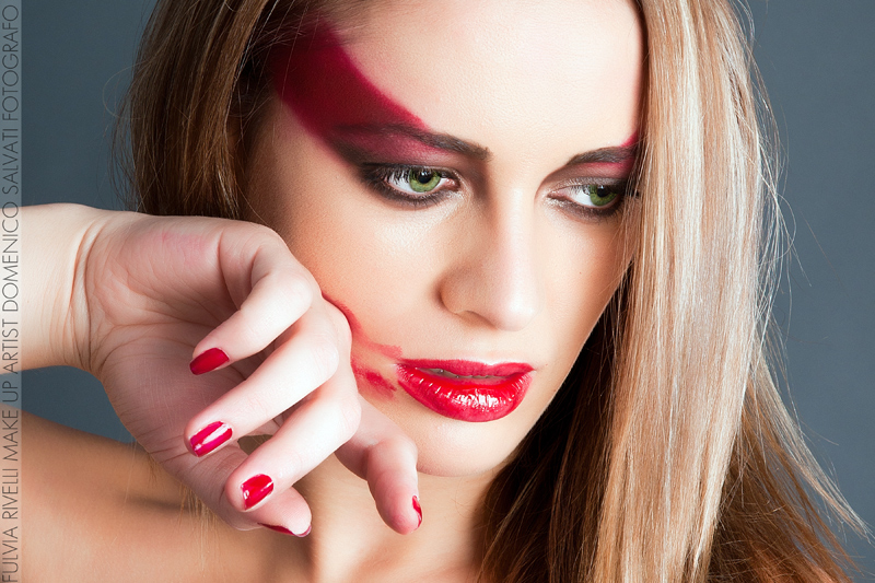 Bella per colori, composizione, taglio/inquadratura e luce, ma non essendo un esperto non posso dire più di tanto sull'illuminazione; tra l'altro non prediligo questo tipo di trucco, per i miei gusti estremo. Ma credo che l'immagine abbia altro da dire; la scelta a livello di drammatizzazione "teatrale" in cui l'interprete in questo caso è a buon diritto la modella e che recita la sua parte con assoluta capacità di resa, con pochissimi elementi a disposizione, un gesto o un pensiero chiaramente esplicitato, basta vedere lo sguardo implacabile, gelido e, cosa molto importante rivolto oltre la macchina fotografica: Basta questa sottile capacità interpretativa per dare all'immagine un profondo significato. Ma la nostra bella aggiunge il gesto quasi stizzito del disfacimento del trucco sanguigno delle labbra, e questo la dice lunga sulla "recitazione" della piccola pièce messa in scena. Da parte tua, Domenico, hai messo al suo servizio a mio parere la tua capacità di lettura, evidenziando il tutto con il colore e la sapiente inquadratura. Di sicuro a mio modesto parere una prova di grande intesa con la modella, che sa il fatto suo e lo evidenzia con maestria.