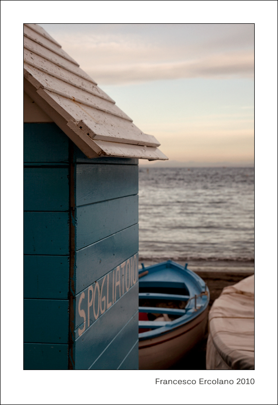 Minimalista, come molto spesso nel tuo stile, elegantemente minimalista. La vedo un po' compressa dal taglio verticale, ma non so come sarebbe stata quadrata o rettangolare. Vedo un po' di distorsione da obiettivo che ha storto un po' le linee - il mare pende da una parte e il casotto dall'altra - roba di poco, ma in scatti così puliti si nota un po' di più.