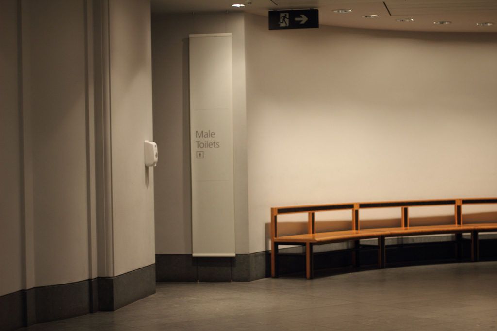 la presenza umana come lettura street/life non la percepisco, io vedo e interpreto un'area di servizio di un albergo, sicuramente di una struttura pubblica, il logo dell'uomo che corre è un simbolo internazionale che significa uscita, si vede dapertutto,e non la trovo inusuale, ne riesce a sottolineare il luogo