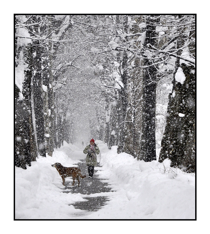 Anche a me piace molto; dacci i dati di scatto, così nella improbabile ipotesi che qua faccia di nuovo un po' di neve proverò a mia volta a fermare in aria i fiocchi che cadono. Bella la galleria definita dagli alberi innevati e i soggetti, donna con cane e personaggio lontano, all'interno di essa. Quasi un bianco e nero, appena modificato da un accenno di rosso del berretto e una sfumatura di marrone nel cane... Sì, direi proprio che è una bella foto.
