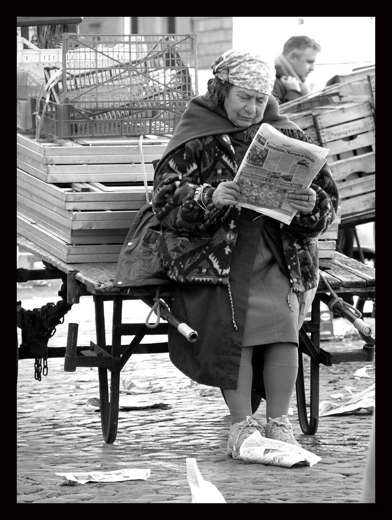 A colpirmi è stata la signore del mercato che dopo aver smontato e collocato il suo banco sul carretto, ha raccolto il quotidiano da terra e si è messa a leggere con attenzione la cronaca del disastro!