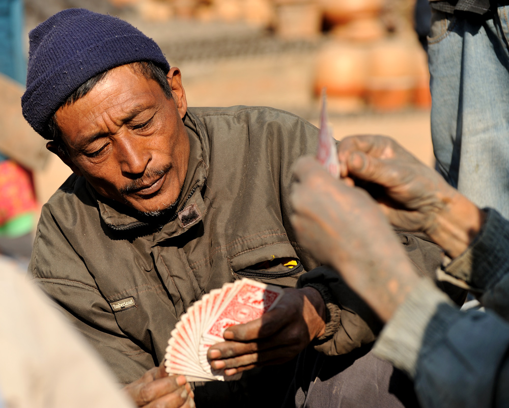 L'inquadratura di grunland è troppo stretta su questo giocatore di carte nepalese. La lunghissima focale tele riesce ad estrapolare in maniera forzata il ritratto di questo uomo non senza elementi di disturbo che sporcano la scena. Transfocature assolutamente non funzionali alla rappresentazione. Una focale più normale o addirittura grandangolare avrebbero raccontato molto di più di questa lontana partita a carte, liberando dall'ambiguità quegli splendidi colori dello sfondo che non aspettano altro che di richiamare tutta una cultura.
