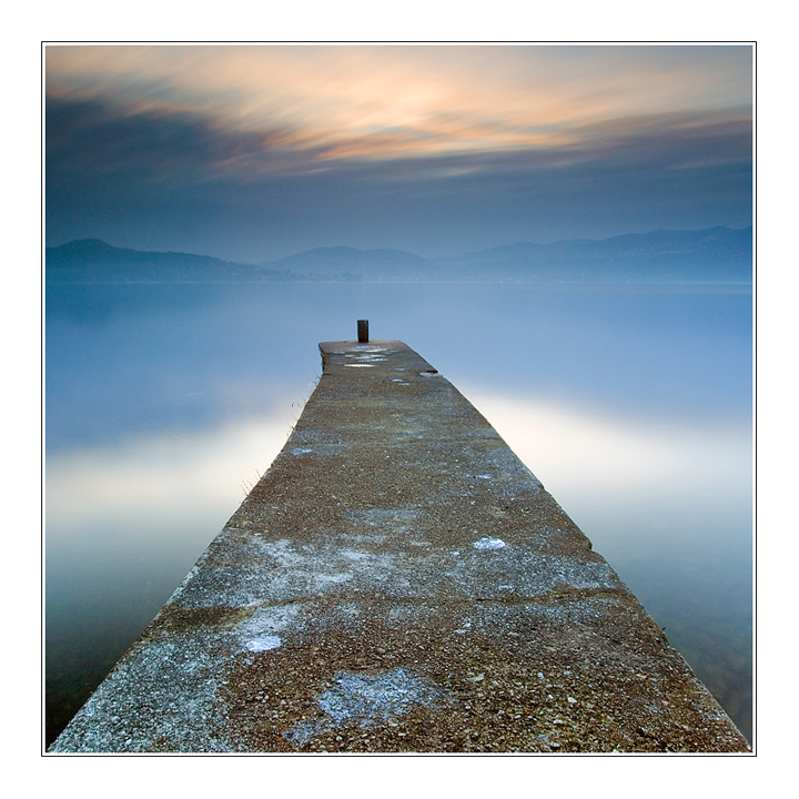 Un silenzio che sfugge in un trascolorare di rosa, come un'alba boreale. Sinceramente bellissima, ormai con le tue foto ci si ripete.... Io credo che il taglio quadrato sia efficace: prima di tutto assecaonda le linee di partenza ala base, con i limiti del pontile, e poi asseconda emotivamente il titolo che hai voluto dare, conclusivo, chiuso nella sua pur relativa compiutezza e "perfezione" .