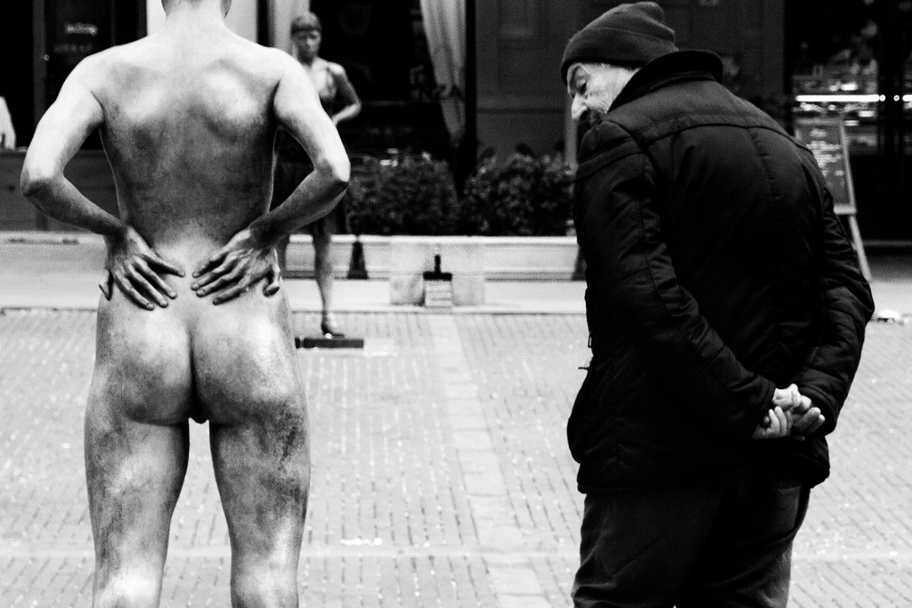 La resa generale del bianco e nero è scarsa ma l'idea di fondo che sottintende l'istantanea è buona. A parte l'effetto esilarante della scena, mi resta impresso molto il soggetto scelto, con quel sopracciglio arcuato e quel naso aquilino. Tutta la postura dell'uomo, con quelle braccia trattenute dietro la schiena, sembra esprimere un giudizio. Un piccolo passo a sinistra avrebbe rivelato per intero l'espressione perplessa del signore, aumentando al massimo l'effetto candid. Mi piace il modo con cui l'autore associa gli elementi della strada. L'occhio di Jobbe è quello giusto, creativo ed aperto alle occasioni del momento.