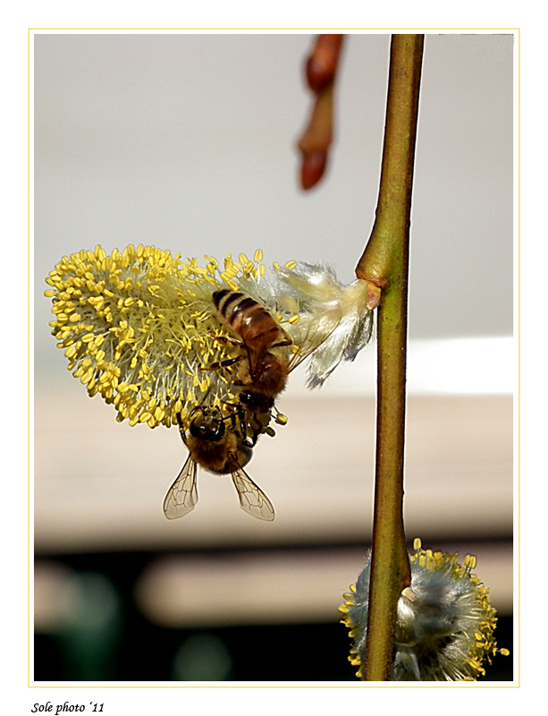 la parte in basso scura distrae dai soggetti come,peraltro,il rametto in alto...mi sarei concentrato sulle api ed il fiore,croppando nel senso che ti ho detto ed avrei dato un po' di mdc...piu' o meno cosi'....ciao Wink