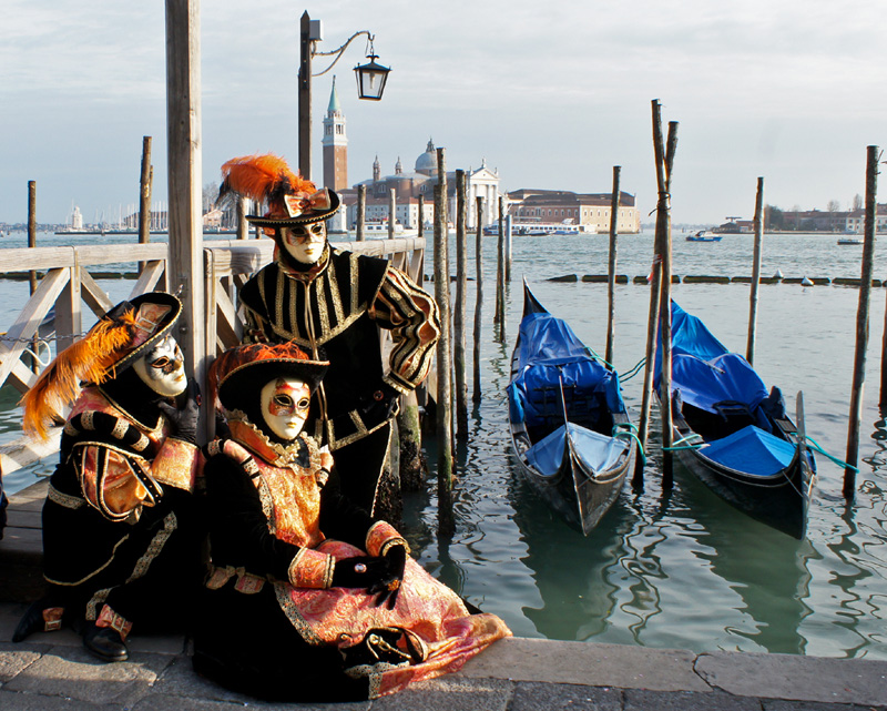 gli elementi principe della Venezia città e di quella mascherata vi sono tutti: Maschere (per l'appunto...), isola di San Giorgio sullo sfondo e le immancabili gondole....