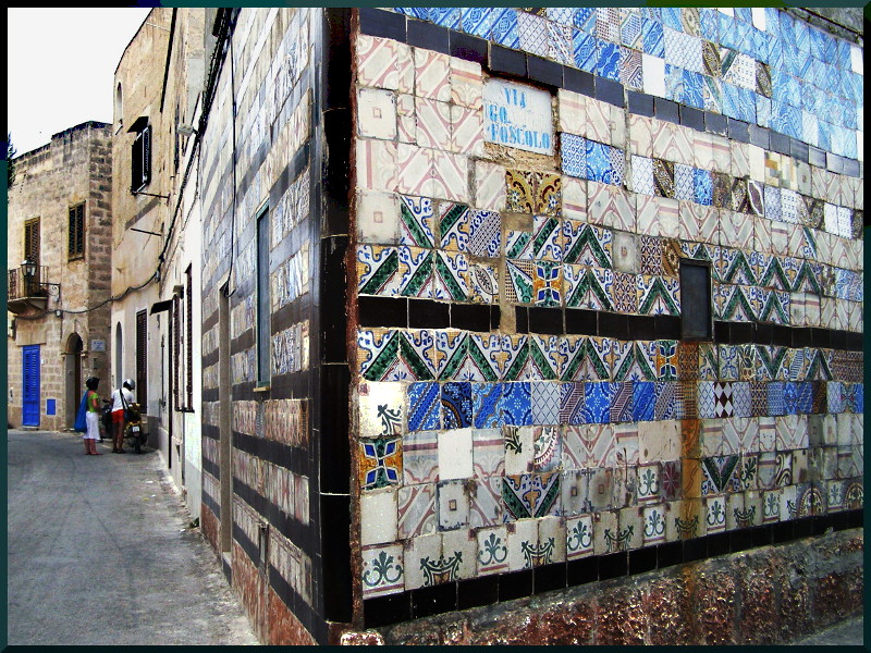 | Un bell'esempio di come, da piastrelle magari scartate o spaiate, possa nascere una decorazione unica. Per apprezzarla tutta, però, se possibile mi sarei spostato indietro tenendo intero lo zoccolo inferiore e lo spigolo del tetto sopra.