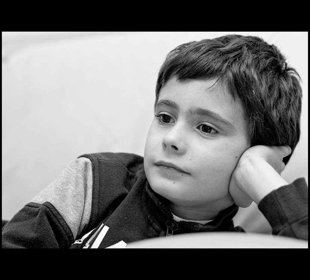 M piace come la posa del ragazzo, ..del tutto naturale e spontanea, si adatti all'orizzontalità del fotogramma agganciando le due diagonali: la principale che sfila lungo il braccio e l'asse del viso sino ad incrociare la linea degli occhi e l'altra data dal braccio di appoggio.
