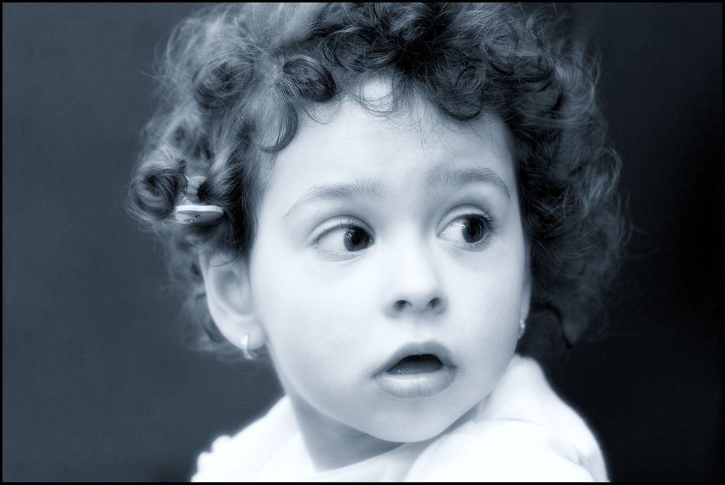 Un viraggio generoso per questo ritratto che ci racconta l'istante di un piccolo sobbalzo emozionale della piccola con quell'impagabile espressione in bilico tra paura e curiosità.