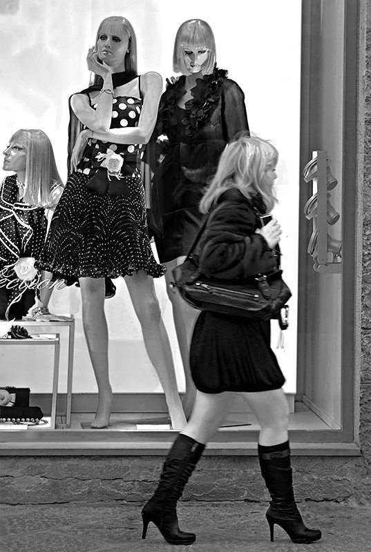Peccato per il poco spazio a sx, ma divertente la gamma di espressioni dei manichini al vedere la donna all'esterno: superiorità, riflessione, invidia.