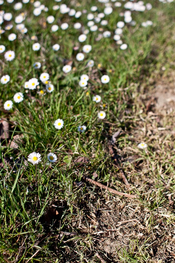 L'idea di questo scatto è quella di enfatizzare alcune margherite che si sono salvate per pochi centimetri dal passaggio del tagliaerba... per questo ho pensato di mettere la linea di taglio sulla diagonale, e tentare di escludere con inquadratura e sfocato elementi di disturbo...