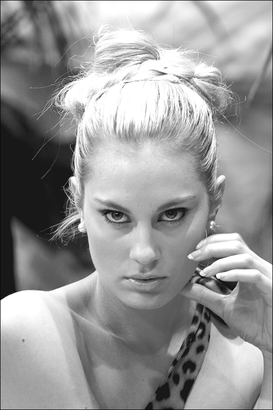 Secondo me l'aria sopra è troppa e abbassare l'inquadratura avrebbe reso più accattivante l'immagine, già abbastanza aggressiva per gli occhi di lei... inoltre i capelli non son venuti un granchè, son bruciati, quindi tagliarli sarebbe stato meglio.