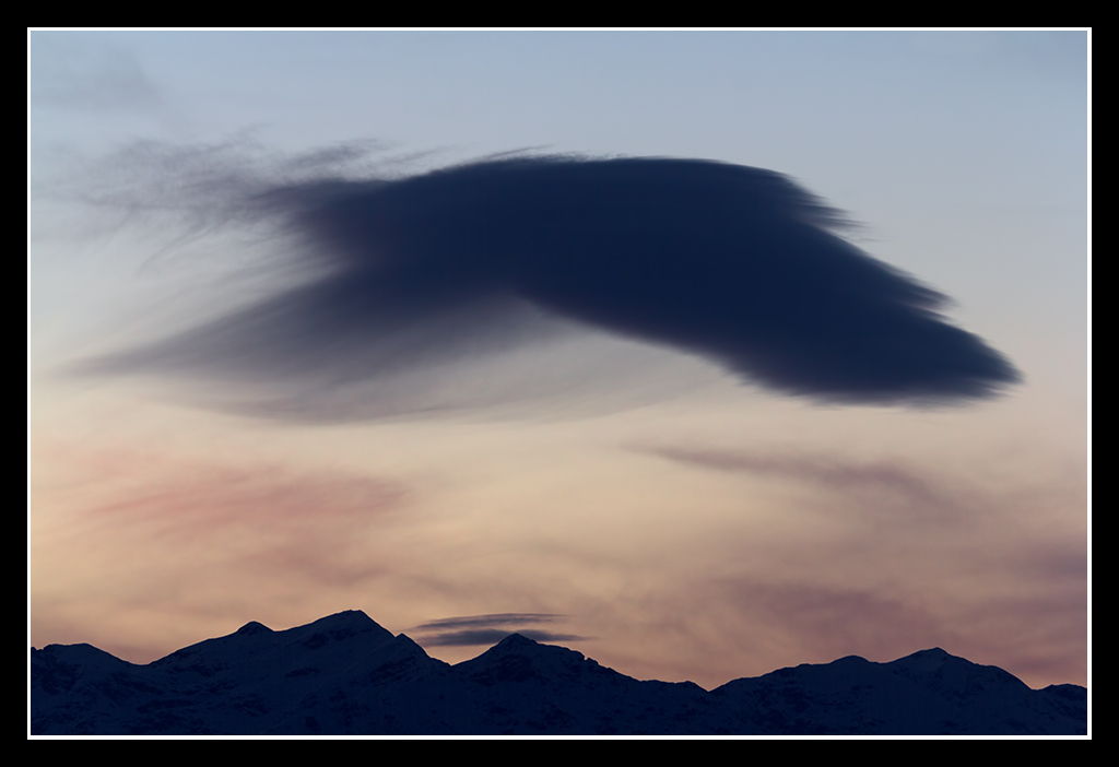 Mentre osservavo il tramonto questa nuvola si è materializzata prendendo le forme di un enorme uccello in volo sulle Alpi.