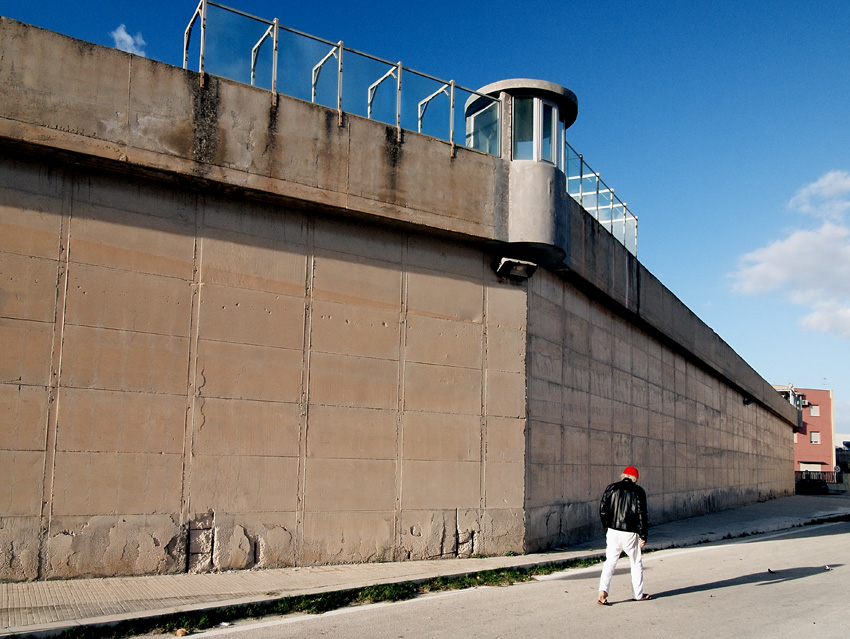 Il muro opprimente di un carcere sovrasta l'omino, che oppone solo il suo berretto rosso intenso.