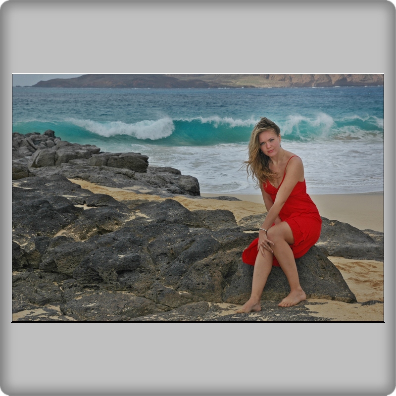 Lo sfondo mi lascia perplesso, quella striscia di roccia, a mio avviso stona un po'; ottima la scelta dell'abito rosso.