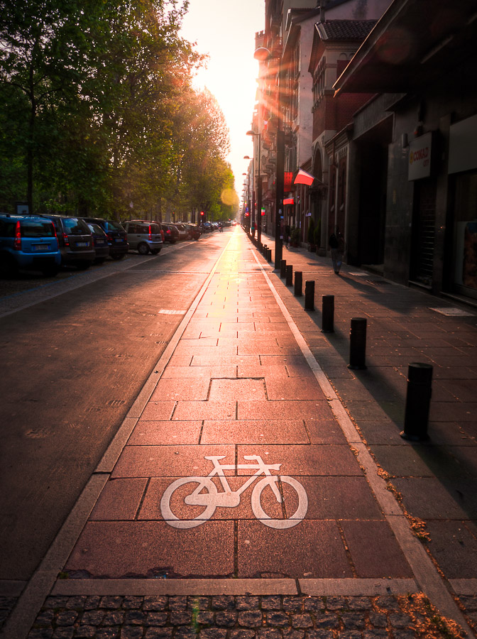 L'intensità luminosa ed il tono della luce posta in alto al centro del fotogramma rappresentano di per sè un valido richiamo iconografico, in virtù del quale mi sembra forse un pò troppo aperta la scena in alto: per cui volendo sintetizzare la chiudere quasi al limite con la prima automobile alla sinistra del fotogramma, lasciando quindi che il segno della luce ed il disegno sul selciato facciano il resto.