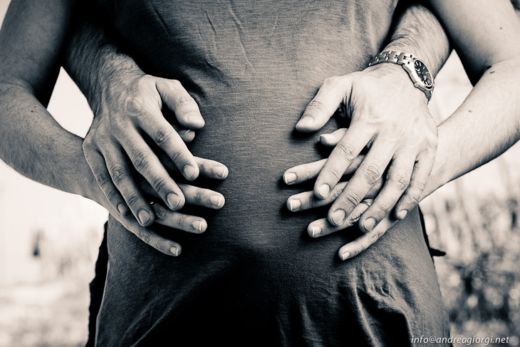 Ne viene fuori uno scatto molto ...sussurrato, ...molto intimo, che più che fare leva sulla forma del pancione indugia sul contatto tra le mani pieno di calore.