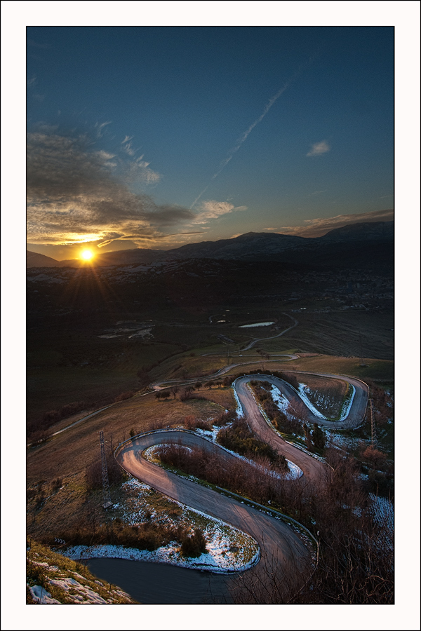 Bella composizione, il serpentone stradale conferisce una dinamica particolare all'intero scatto. Perfetta la gestione della luce !!!