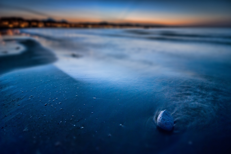 La parte a fuoco di questa foto è parzialmente annegata dall'acqua in movimento, che rende non nitida una porzione di spiaggia: non il sasso però che risalta in nitidezza come la restante parte della spiaggia con i sassolini non invasa dall'acqua. Questo fuoco-non fuoco restituisce particolarità all'immagine in cui anche il paesaggio in lontananza è fuori fouco.