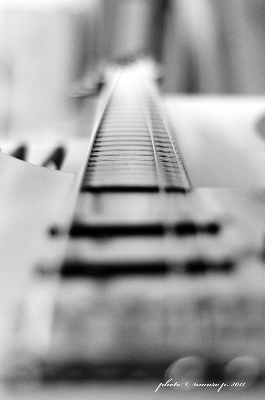 Per arrivare a questo scatto, ne ho fatto parecchi. Questo è stato eseguito su cavalletto con il flash, facendo vibrare la corda che non era perfettamente tesa in quanto la chitarra è in disuso e con un diaframma f1.8. Fra le varie prove questa è quella che ho conservato in quanto, secondo me, esprime maggiormente il concetto della vibrazione sulla corda.